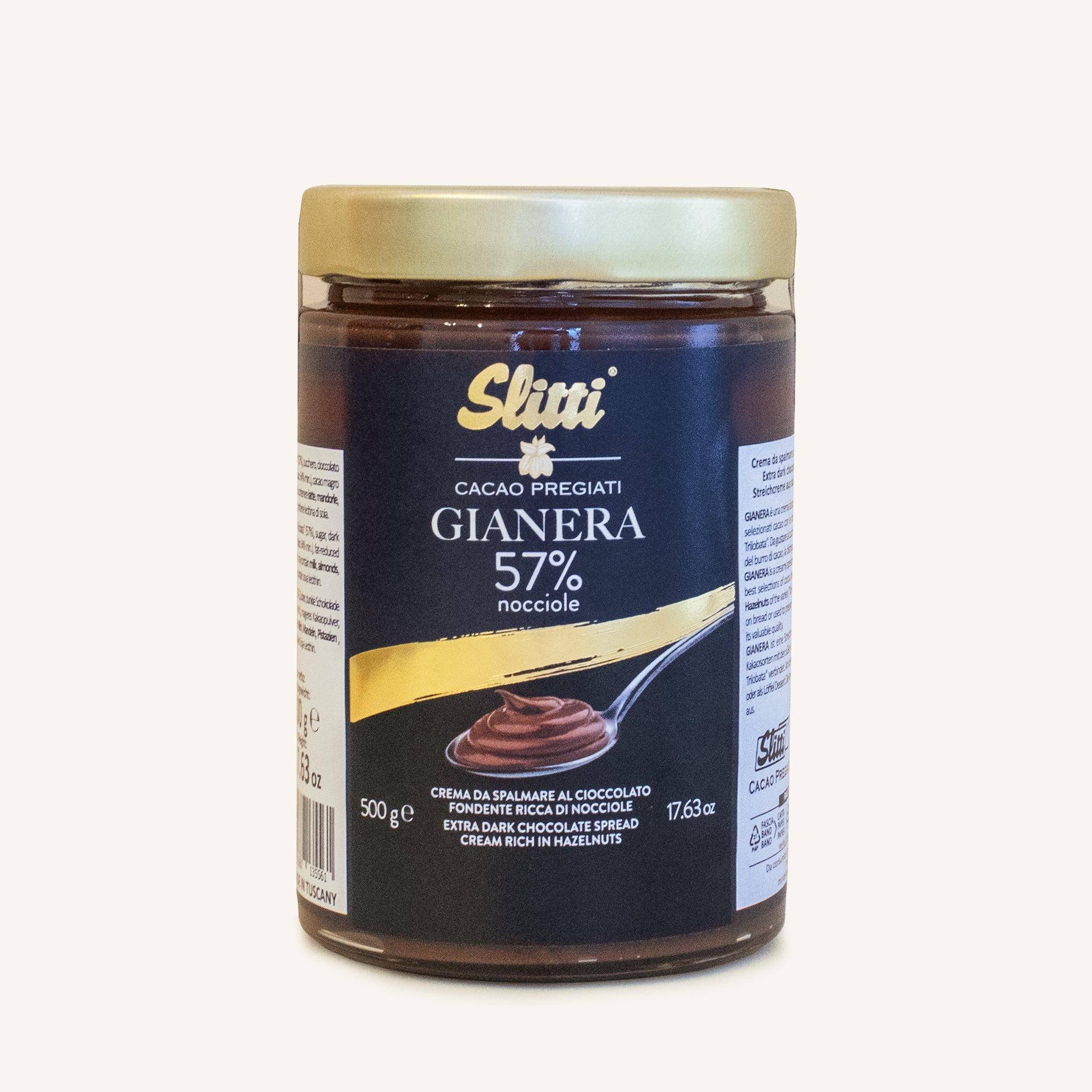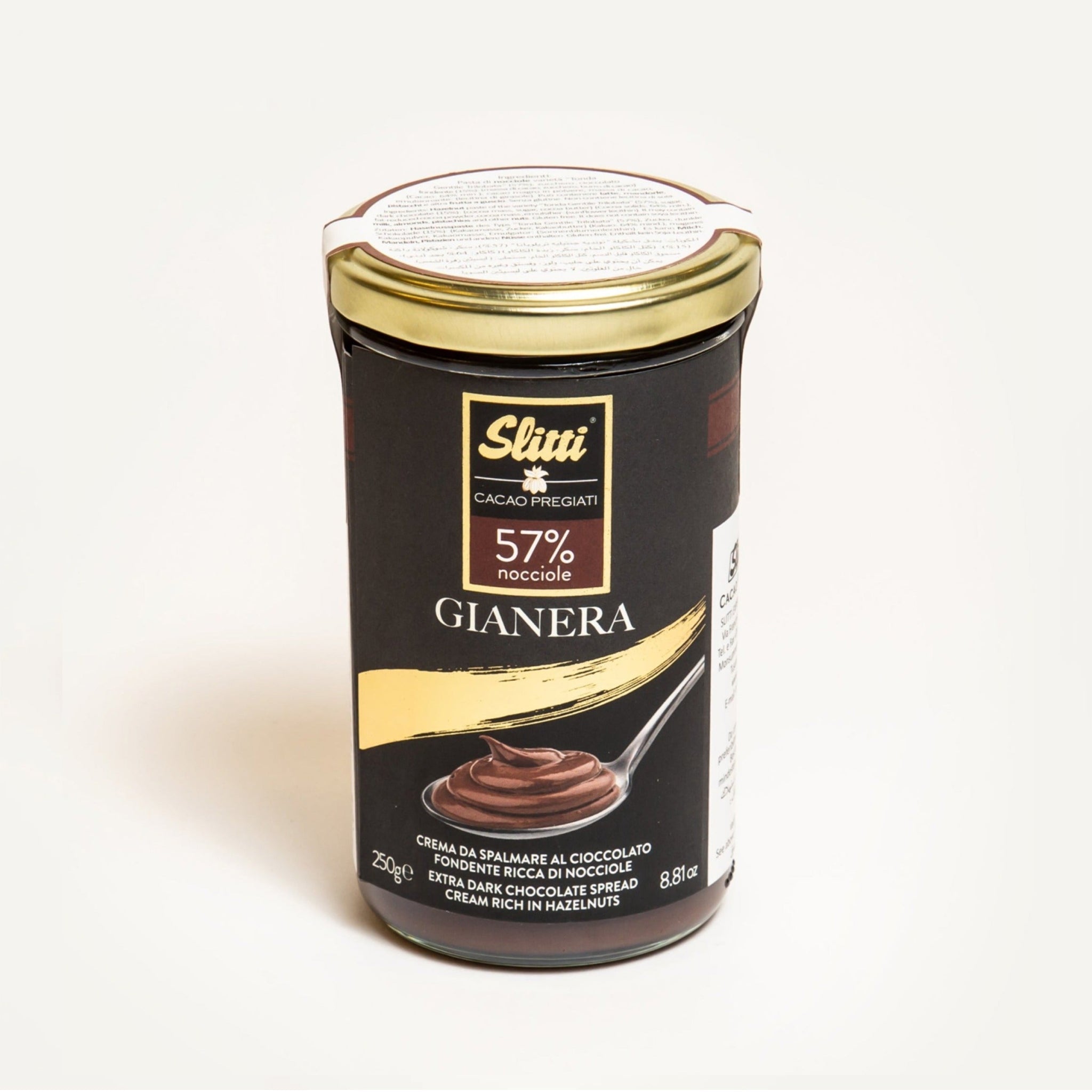 Gianera es una crema de chocolate negro hecha dulce y fragante por 57 por ciento Avellanas de Langhe. El uso de manteca de cacao las distingue por su calidad.
