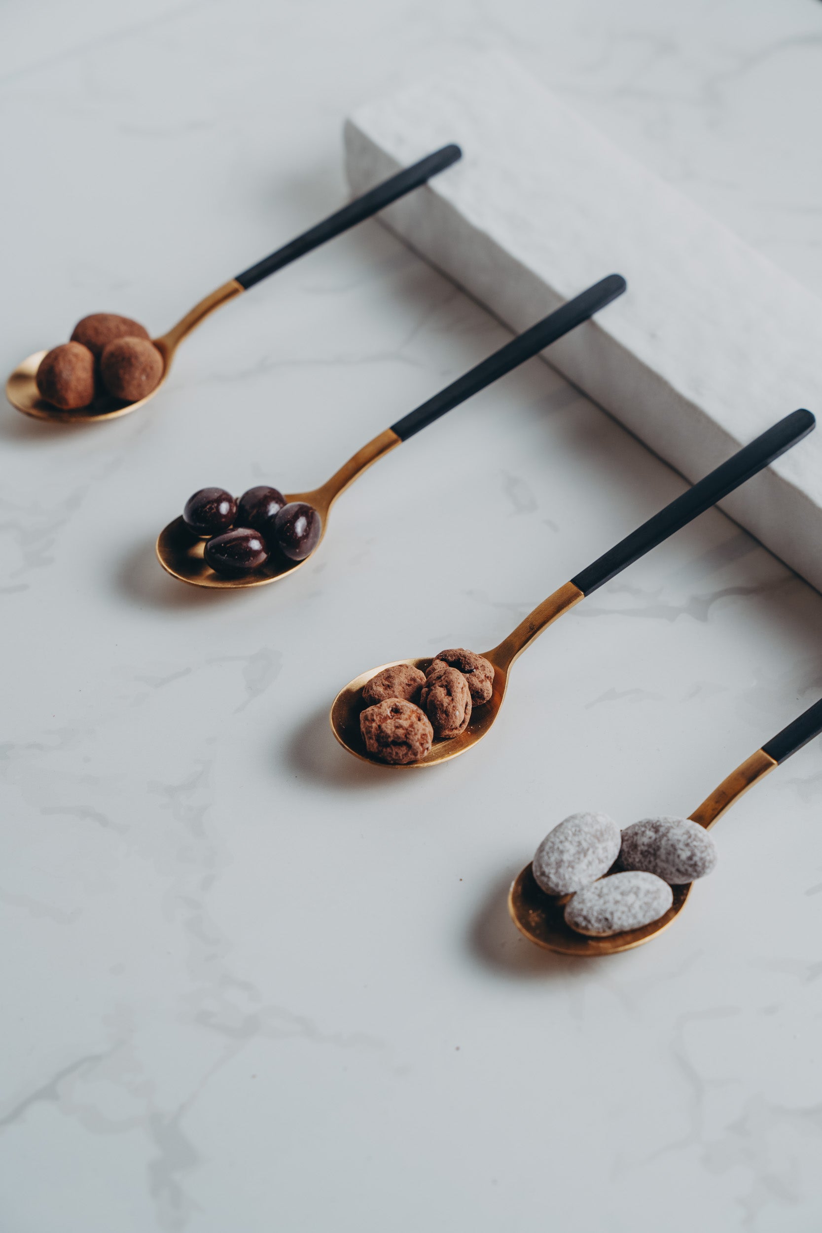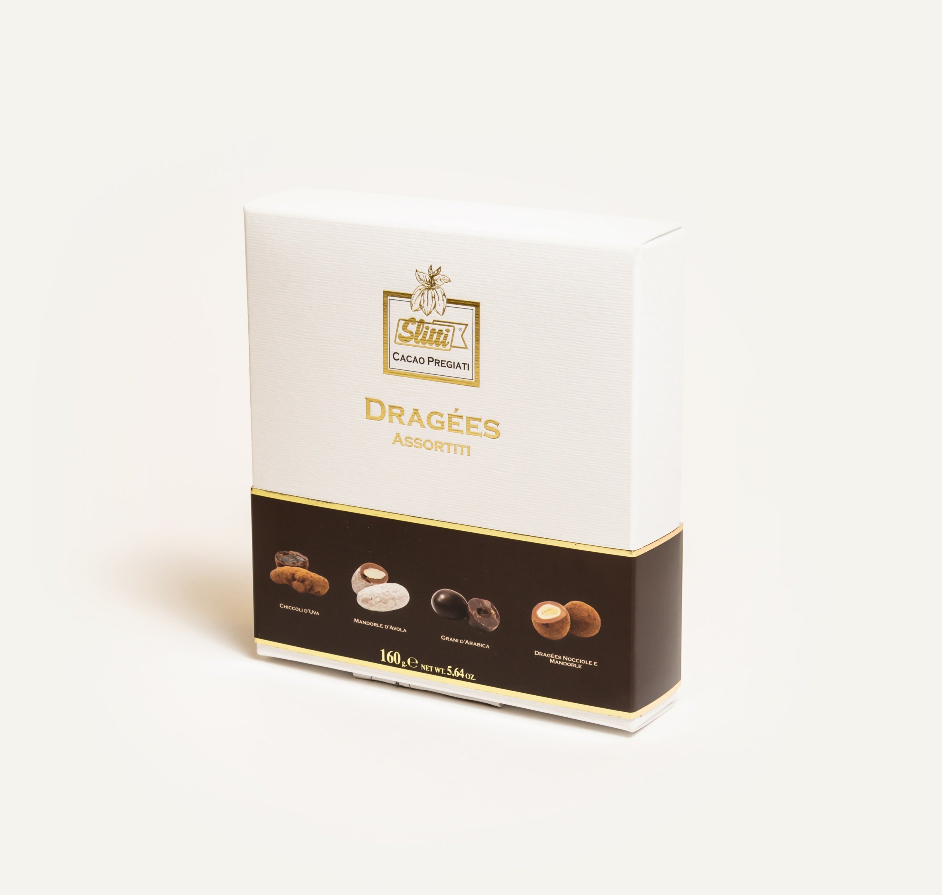 Una caja surtida de Dragées Slitti que contiene cuatro variedades: las clásicas y apreciadas Dragées con Avellanas Tonda delle Langhe y Almendras Italianas caramelizadas y cubiertas de chocolate, las finas y delicadas Almendras de Avola, los aromáticos Granos 100% Arábica y las dulces Uvas de Uvas.