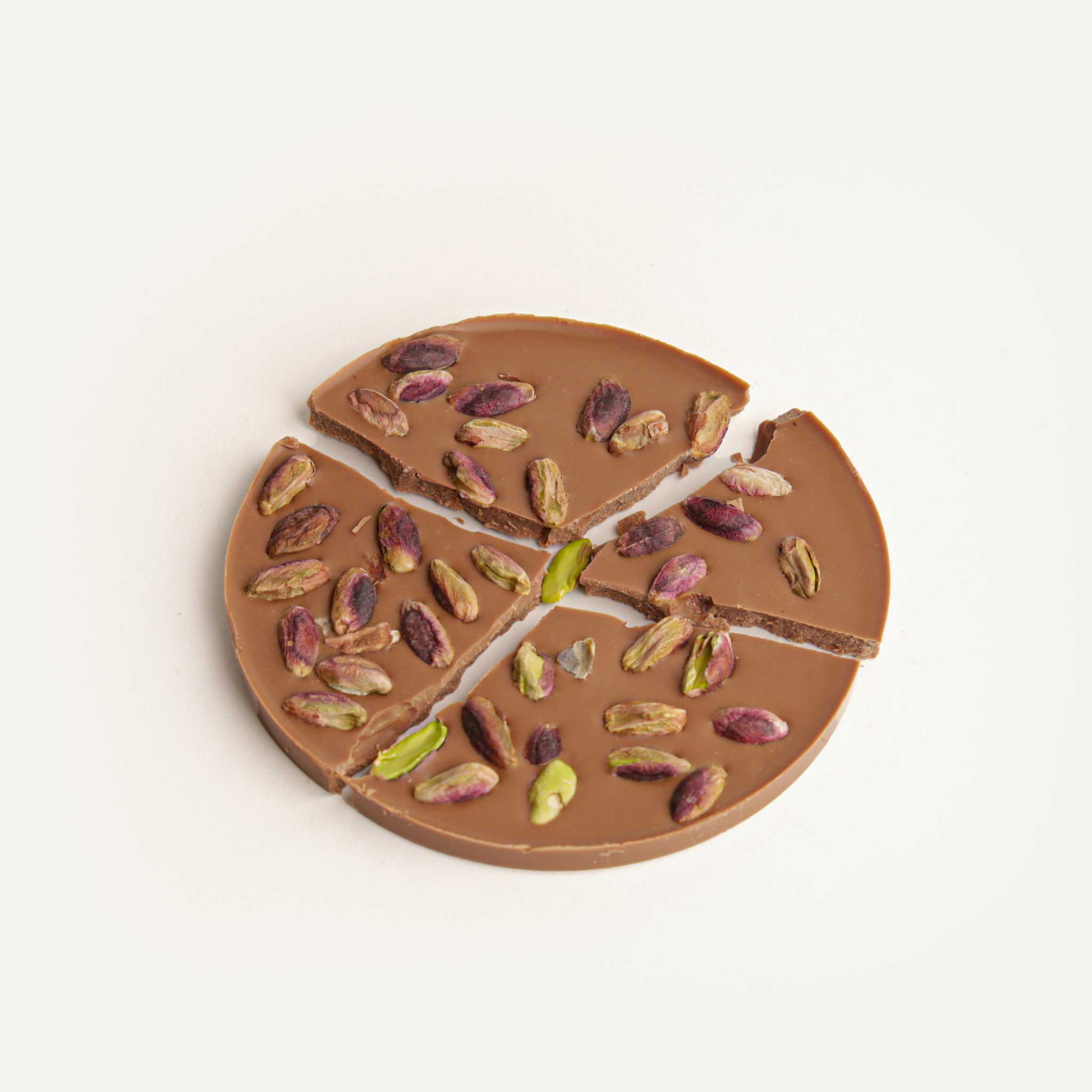 Se trata de una fina tortina de chocolate con leche, enriquecida con pistachos verdes de Bronte .